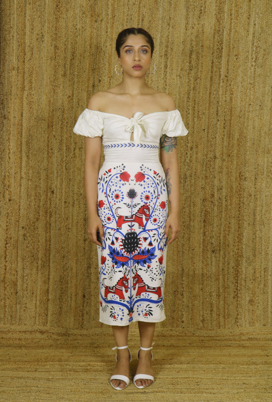 Inspired by Jamini Roy’s horseback paintings—his bold strokes echoing the energy of Kalighat folk and tribal art. The print, drawn from his 1940s-50s masterpieces, speaks of power, movement, and untamed spirit. The off-shoulder cuts reclaims space, much like the women in Roy’s art. Draped in heritage, yet undeniably modern.