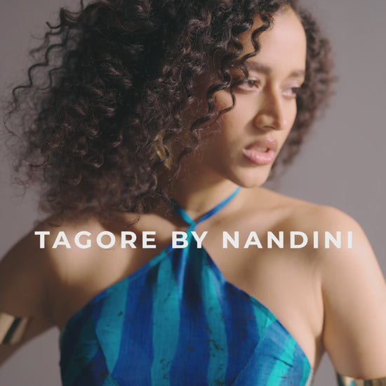 The Millionaire Halter Dress is crafted in hand-woven Murshidabad silk and hand-painted by artisans in Shrirampur with flowing, psychedelic patterns inspired by the Bay of Bengal. Traditional batik cracks run through the surface, giving the fabric its textured depth while remaining strikingly contemporary in a body-skimming halterneck silhouette. At its center, the owl motif—the vehicle of Goddess Lakshmi—symbolizes prosperity, wealth, and individuality. It is this resonance that gives the dress its name: the Millionaire. Fluid, wavy, and unmistakably modern, this is resortwear designed for evenings by the water, celebratory gatherings, and moments that call for effortless luxury.