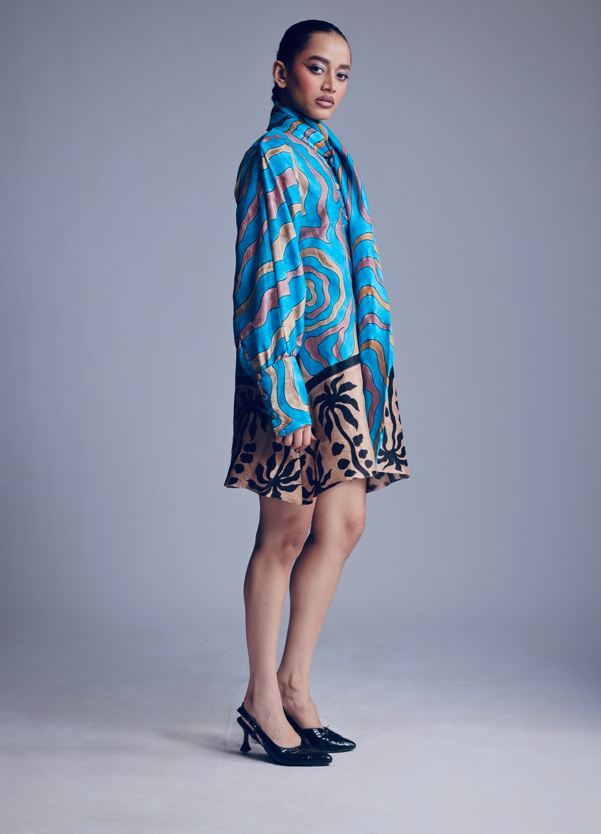 Designed for days when you want to move as freely as the tide, this hand-painted dress lets you carry the ease of the coast wherever you go. Woven in Murshidabad silk and brushed with palm tree motifs in Shrirampur, it drapes like an oversized scarf—light, fluid, and made to make you the story.