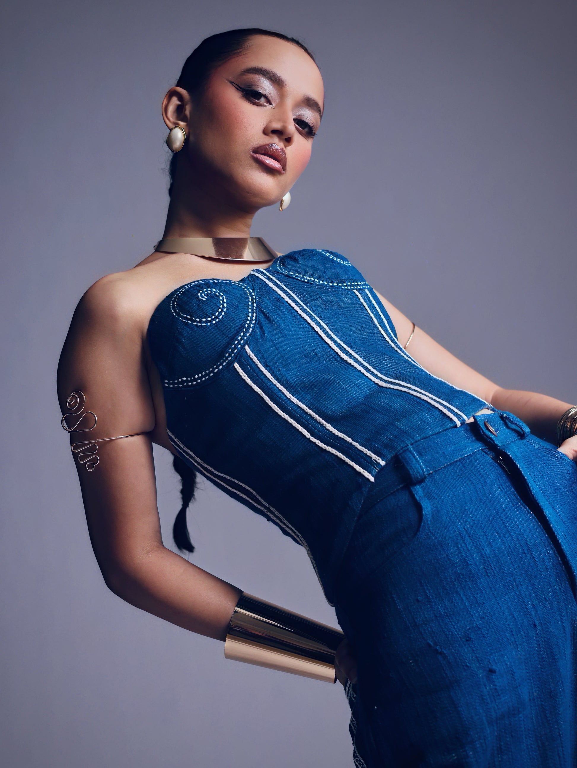 There’s an ease in slipping into this corset, its handwoven Phulia denim carrying the quiet strength of Bengal’s rivers. Kantha embroidery, hand-done by artisans in Shantiniketan, traces braided currents, while wave-like boning follows the body with gentle structure. An everyday kind of elegance, rooted in craft.